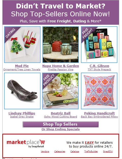 - Highlights your newest products (include a link to your Top Sellers and a video) and why retailers were excited about your line at market